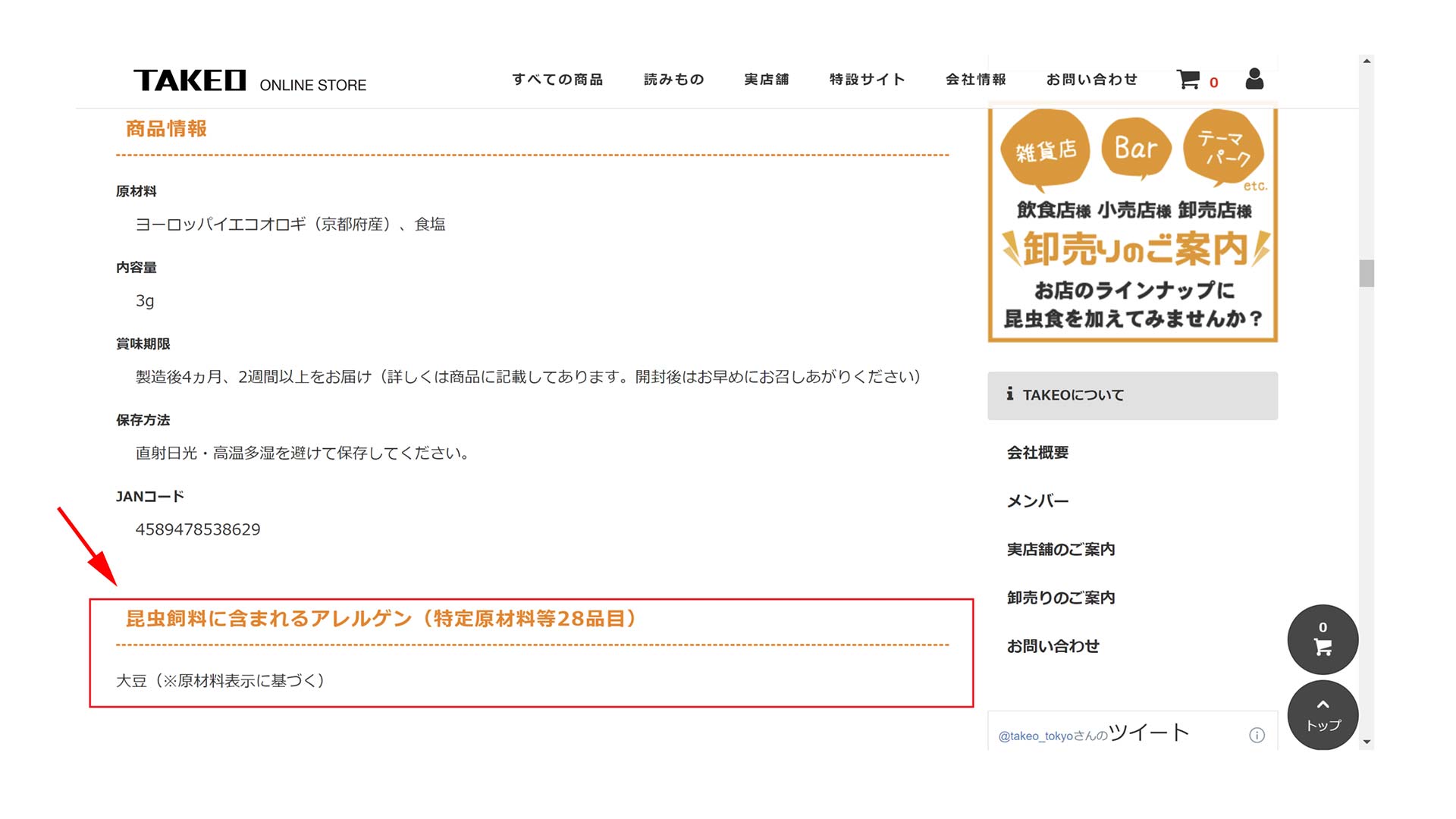 ②TAKEOの一部の商品で、昆虫養殖に用いられる飼料に含まれる特定原材料等28品目について情報提供をします。