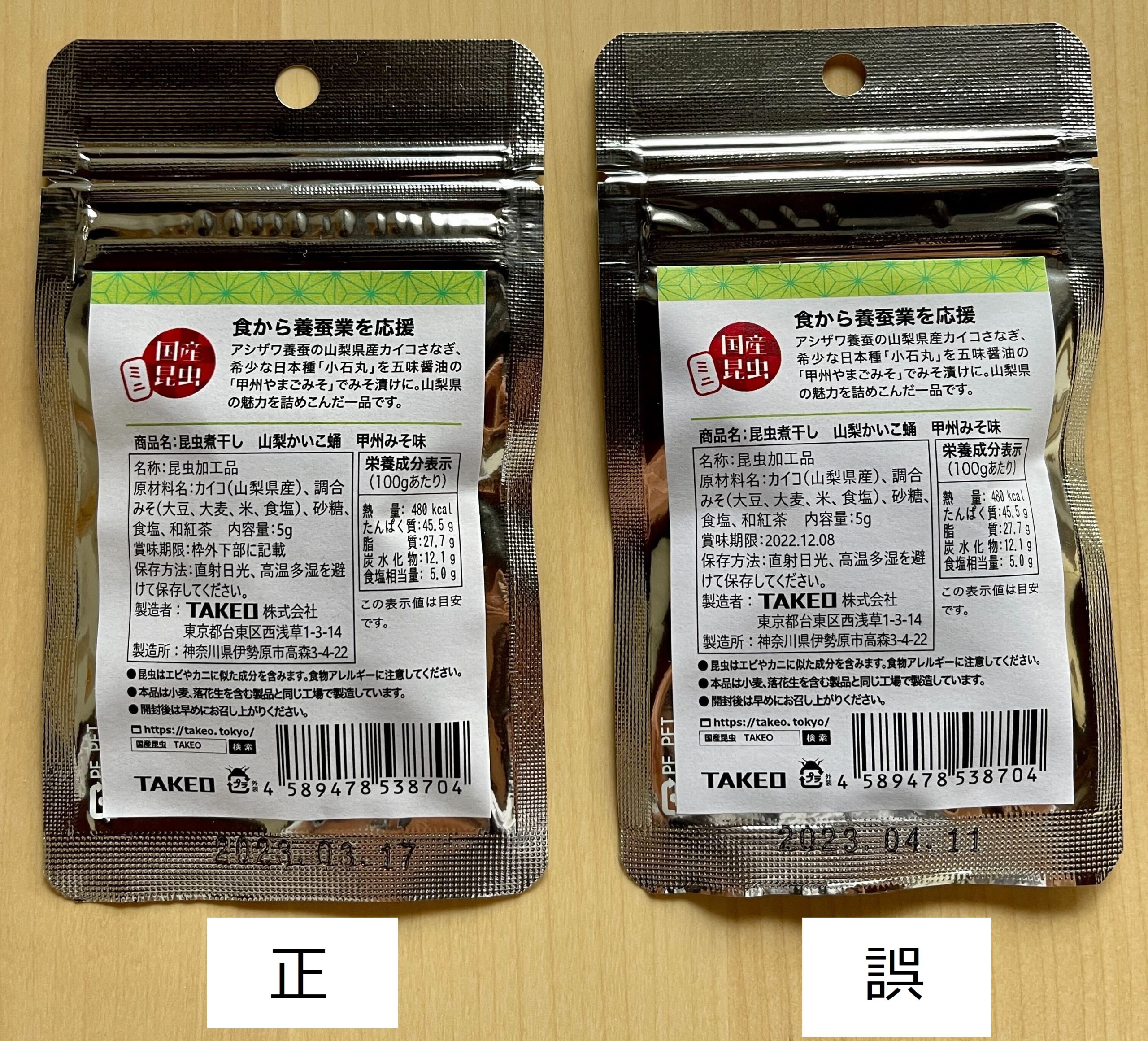 この度、弊社が製造いたしました『山梨かいこ 甲州みそ味』において、賞味期限表示の誤りが判明いたしました。賞味期限表示シールの印刷設定と確認ミスにより生じたものです。お客様に多大なご迷惑とご心配をお掛けしましたことを、心よりお詫び申し上げます。