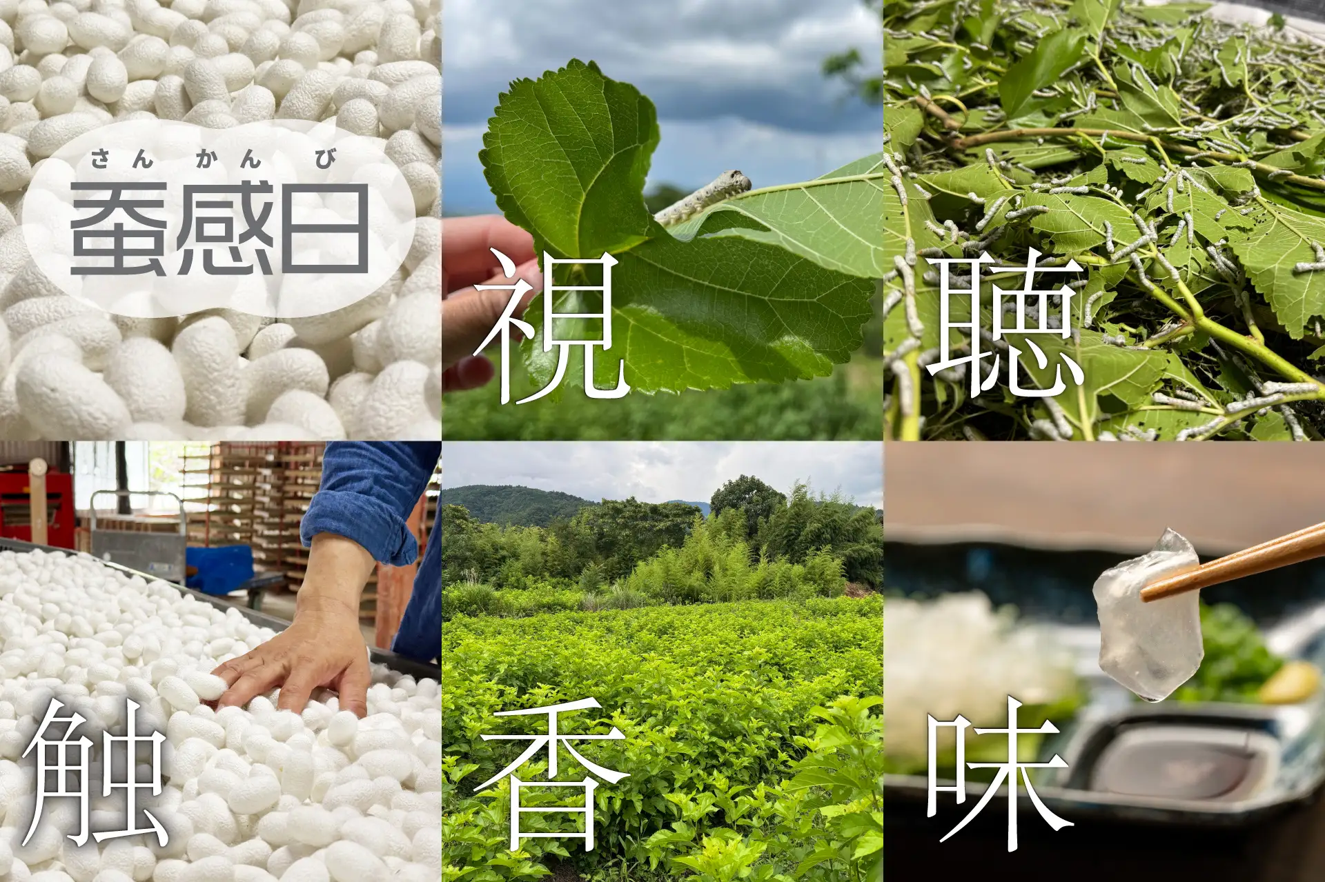 私たち人間は、古くから蚕と共に生きてきました。このツアーでは、大地に育つ桑の葉を摘み、蚕が成長し繭をつくる過程、さらに繭を食として味わい私たちの体の一部になるまでを体験していただけます。命がつながる営みを実感するとともに、ツアー後には「蚕感日」限定グッズの販売も予定しています。ぜひお楽しみください!