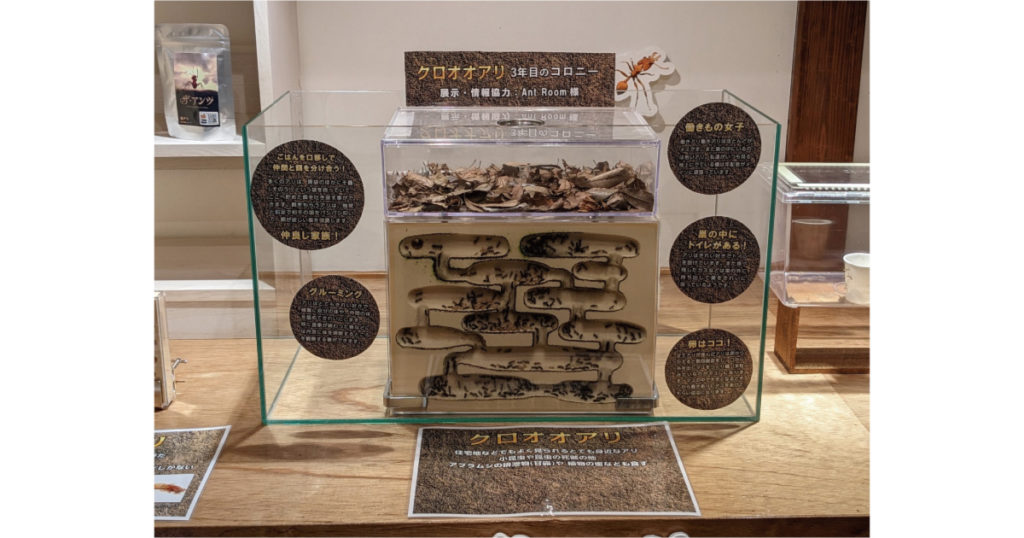 展示には、みなさんご存知「AntRoom」島田さんにご協力いただきました!!なかなかお目にかかれない3年もののクロオオアリのコロニーを観察できます。女王蟻の大きさにみなさん驚くはず!!